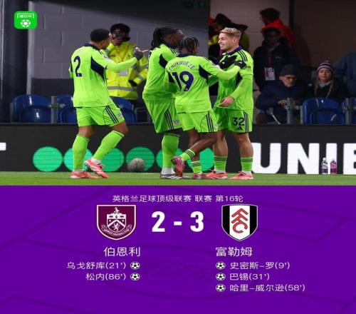 北京时间12月14日,英格兰足球超级联赛第16轮展开较量,伯恩利坐镇主场迎战富勒姆。比赛伊始,富勒姆率先打破僵局,史密斯-罗接哈里-威尔逊传球后冷静施射破门,帮助球队取得领先。随后伯恩利迅速做出回应,乌戈舒库在库伦的助攻下完成破门,将比分扳平。第31分钟,富勒姆再度发力,哈里-威尔逊再次送出精准助攻,巴锡得球后破门得分,客队重新掌握优势。下半场,丘库埃泽为哈里-威尔逊送上妙传,后者抓住机会建功,进一步扩大比分。临近终场前,伯恩利由松内挺身而出,攻入一球试图扭转局势。最终全场比赛结束,伯恩利以2比3不敌富勒姆。