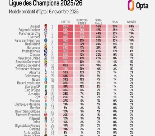 Opta预测欧冠夺冠概率:阿森纳24%第一、拜仁、曼城二三位