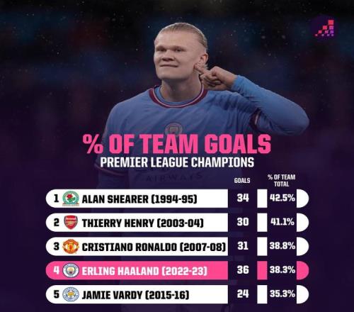 北京时间10月31日,知名数据平台Opta发布英超历届冠军球队头号射手(夺冠当赛季)进球比例榜,阿兰-希勒42.5%位居第一,亨利41.1%第二,C罗38.8%位列第三,哈兰德38.3%第四。