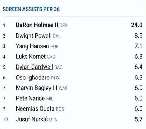 在这份统计中,排名第一的是掘金队的霍姆斯,他每36分钟掩护助攻次数达到了24次,断档领先,第二名是独行侠的鲍威尔,他是8.5次,第三是杨瀚森的7.1次,第四到第十名,分别是凯尔特人队的科内特(6.8次)、国王队的考德威尔(6.4次)、太阳队的伊戈达罗(6.3次)、奇才队的巴格利(6次)、雄鹿队的南斯(6次)、凯尔特人的科塔(6次)、爵士队的努尔基奇(5.7次)。